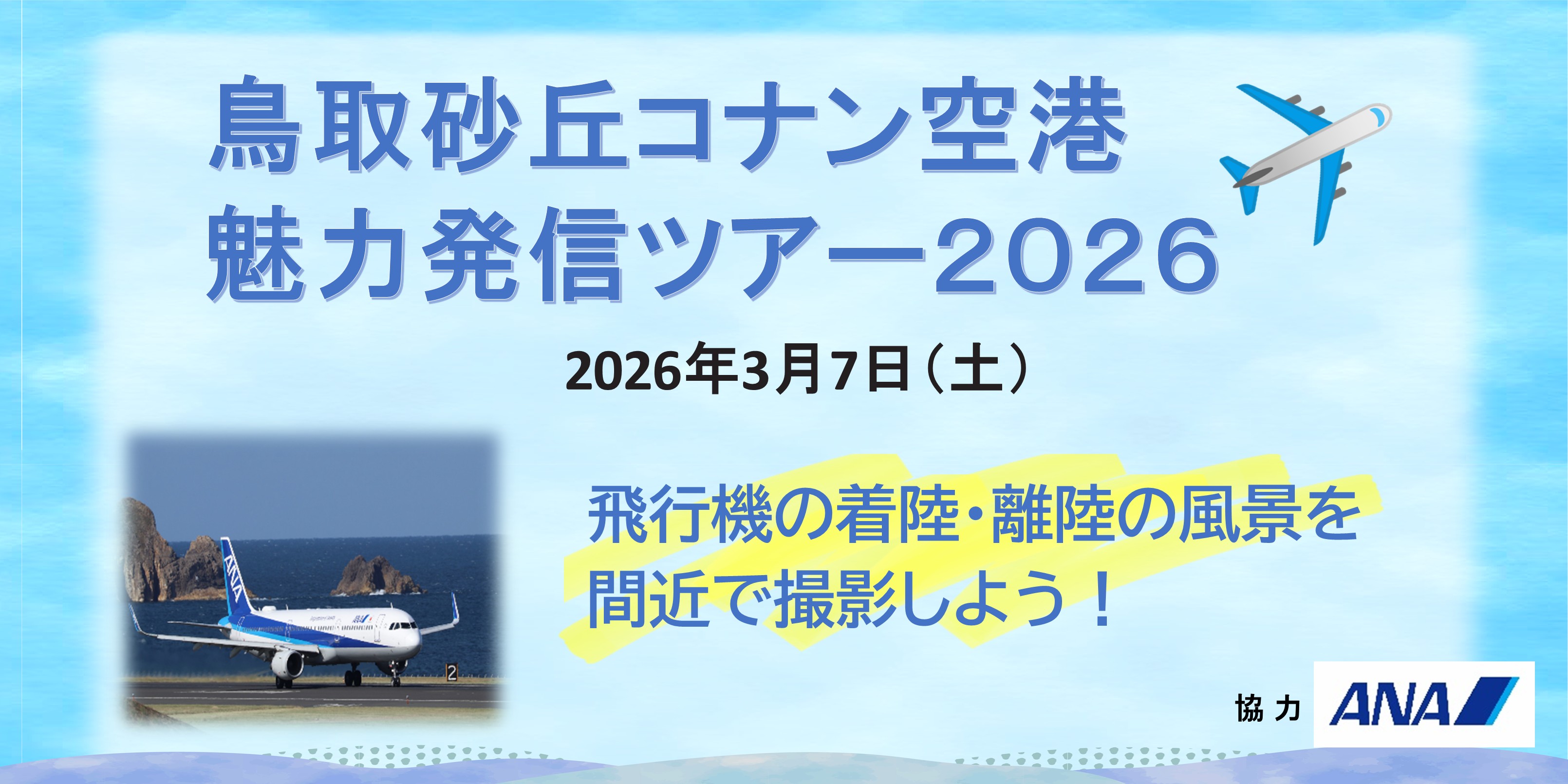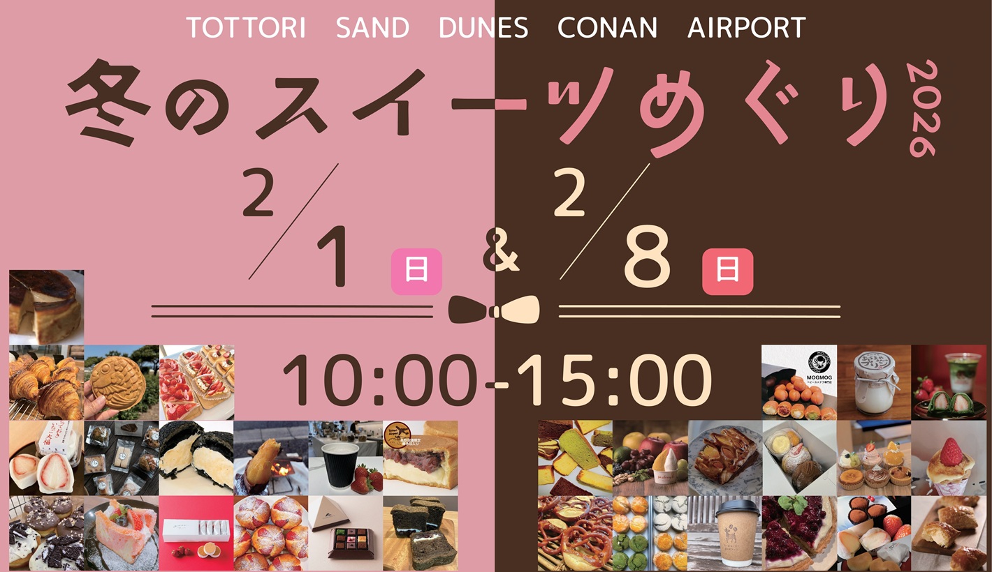 NEWS おしらせ ニュース イベント情報 冬のスイーツめぐり2026開催! 【運行期間延長】無料シャトルバス運行決定! レンタサイクルをご利用ください! Magic de 婚活 春のグループ旅行キャッシュバックキャンペーン! 鳥取砂丘コナン空港魅力発信ツアー2026【募集中】 1/25 ワールド・スマイル・ビレッジ 【12月25日~2月15日搭乗分!】鳥取空港サポートクラブプレゼントキャンペーン 早朝コーヒー販売のお知らせ